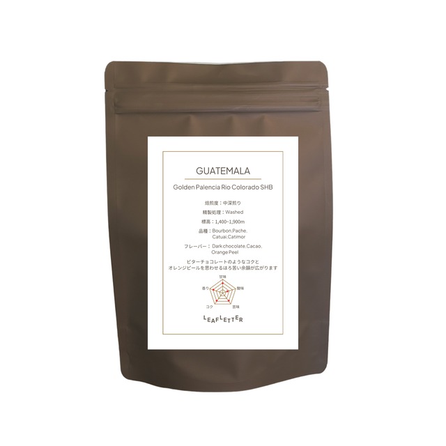 GUATEMALA - Golden Palencia Rio Colorado SHB 150g ※中深煎り 【コーヒー豆情報】 容量:150g 焙煎度:中深煎り 焙煎者:LEAFLETTER 神奈川県川崎市幸区柳町8-3 柳町ビル101 精製処理:Washed 標高:1,400~1,900m 品種:Bourbon,Pache,Catuai,Catimor フレーバー:Dark Chocolate,Cacao,Orange Peel 【コメント】 ビターチョコレートのようなコクに、じんわり広がるカカオの甘い余韻 ほのかにオレンジピールのニュアンスが重なり、なめらかな口当たりが長く続きます 落ち着いたコクとやわらかな甘さ ゆっくり味わいたくなるグアテマラを、中深煎りで引き出しました